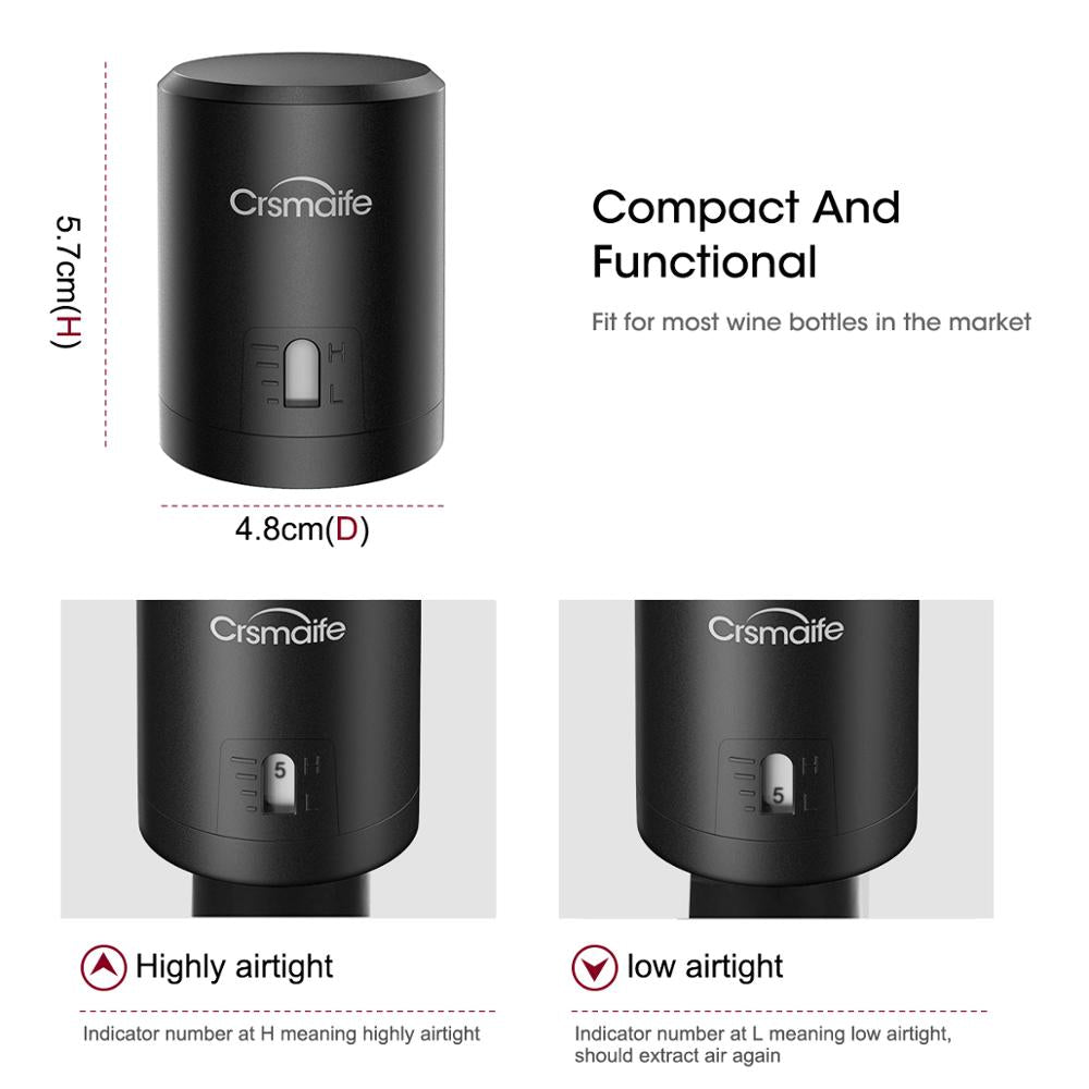 O Tampão de Garrafa de Vinho Tinto de Vácuo é feito de materiais duráveis, como PC e silicone. Com dimensões de 4,8cm de diâmetro e 5,7cm de altura, ele é compatível com garrafas de vinho de 750ml. A cor disponível é preta.